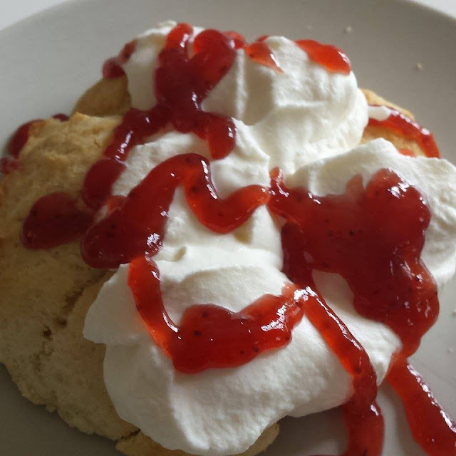 Manden bagte scones søndag eftermiddag. Vi fik dem serveret med flødeskum og jordbær syltetøj. Jeg er ikke en scones fan, synes ofte de er tørre men nu havde jeg jo heller ikke fået mandens før. I hvert fald ikke dem her (ny opskrift han havde fundet) og ikke på den måde her. Så jeg måtte bøje mig i støvet og indrømme de smagte lækkert luftige og flødeskummet samt syltetøjet, var helt perfekt til den luftige scone. Nu har jeg vist fået det slået fast så er du i nabolaget, får jeg da lige manden til at smide en gang scones i ovnen så du kan smage dem.